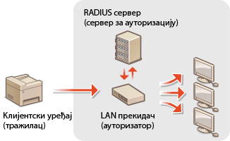 IEEE 802.1X је стандард и механизам за блокирање неовлашћеног приступа мрежи, помоћу колективног управљања информацијама о ауторизацији корисника. Ако апарат покуша да се повеже на 802.1X мрежу, он мора да спроведе поступак ауторизације корисника да би проверио да ли комуникацију врши овлашћени корисник. Информације о провери аутентичности се шаљу и проверавају помоћу RADIUS сервера, који дозвољава или одбија комуникацију са мрежом у зависности од последица провере аутентичности. Ако провера аутентичности не буде успешна, LAN прекидач (или приступна тачка) блокира приступ мрежи споља. Апарат можете да се повеже на 802.1X мрежу као клијентски уређај.