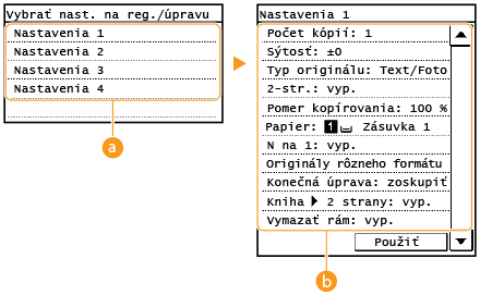 Môžete uložiť až štyri často používané kombinácie nastavení kopírovania. Jednoduchým výberom uloženej potrebnej kombinácie nastavení môžete eliminovať potrebu konfigurácie rovnakých nastavení pri každom kopírovaní, napríklad ak často nastavujete počet kópií na 5, nastavte položku <Vymazať rám> na možnosť <Zap.> a zvýšte ostrosť pri kopírovaní. Môžete uložiť kombinácie nastavenia ako <Nastavenia 1> až <Nastavenia 4>.