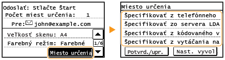 Ak chcete odoslať e-maily priamo zo stroja, najprv musíte dokončiť prípravy vrátane špecifikácie nastavení poštového servera. Konfigurácia nastavení skenovania (odosielanie e-mailu)