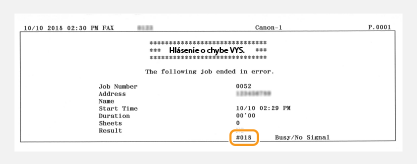 Ak tlač nie je úspešná alebo ak nemôžete odoslať alebo prijať fax, prípadne naskenovaný dokument, alebo ak sa vyskytne iná chyba, chyba sa zobrazí v hlásení alebo v správe na obrazovke <Monitor stavu> ako trojciferné číslo (chybový kód). V nasledujúcej časti nájdete príčiny a riešenia jednotlivých chybových kódov. Postup vytlačenia chybového hlásenia a informácie v hlásení nájdete v časti