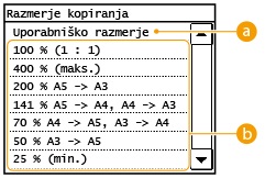 Kopije lahko povečate ali pomanjšate z uporabo vnaprej nastavljenega razmerja kopiranja, na primer <A5> → <A4>, ali z nastavitvijo uporabniškega razmerja kopiranja v korakih po 1%.