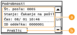 Prikažejo se število poslanih dokumentov, nastavitve in druge podrobnosti. Če želite samo preveriti podrobnosti, vendar ne želite preklicati pošiljanja, pritisnite