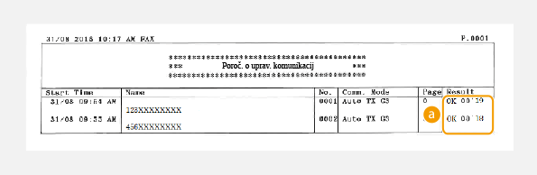 "OK" označuje uspešen prenos dokumenta, "NG" and trimestno število (koda napake) označuje neuspešen prenos (