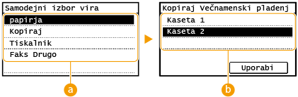 ). Samodejno izbiranje kaset je vedno omogočeno za tiskanje na papir, ki je podajan iz večnamenskega pladnja.