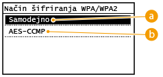 ![]() <Samodejno>Nastavi napravo tako, da ta samodejno izbere AES-CCMP ali TKIP tako, da bo ustrezalo nastavitvi brezžičnega usmerjevalnika.