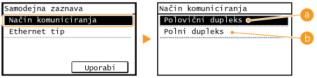 dotaknite se <Polovični dupleks> ali <Polni dupleks>.![]() <Polovični dupleks>Izmenično pošilja in sprejema komunikacijske podatke. Izberite, če je stroj povezan v omrežno napravo po sistemu polovičnega dupleksa.