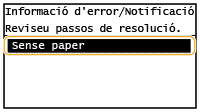 En alguns casos, quan es produeix un error, apareixen instruccions sobre com respondre a l'error. Seguiu les instruccions de la pantalla per solucionar el problema. A l'exemple següent es mostra la pantalla que apareix quan es produeix un encallament de paper (