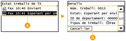 <Detalls>Mostra informació detallada sobre el document que heu seleccionat a la llista. Si heu especificat diverses destinacions, el nombre de destinacions especificades apareix a la pantalla. Per comprovar els detalls de les diverses destinacions especificades, toqueuNombre de destinacions >. Si trobeu un document que no necessiteu, toqueu Cancel·lar> o <Eliminar>, i toqueu <Sí>.