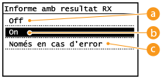 Podeu comprovar els registres dels documents de fax rebuts mitjançant la impressió d'un Informe amb resultat RX. L'informe es pot imprimir cada vegada que finalitzi una transmissió, o només quan es produeixi un error de recepció.