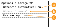 ![]() Si apareix <On>, toqueu <Obtenció automàtica>, i establiu <Seleccionar protocol> i <IP automàtica> en <Off>.