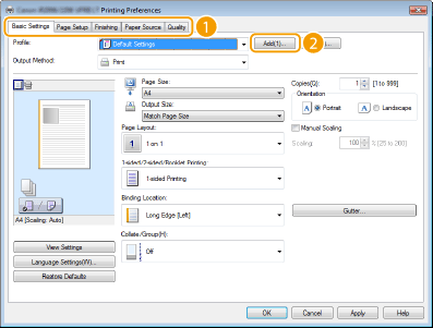 Especificar combinacions d'opcions com ara "orientació horitzontal a una cara sobre paper de mida A4 en mode d'estalvi de tòner" cada vegada que imprimiu pot resultar molt lent. Si deseu les combinacions d'opcions d'impressió que utilitzeu habitualment com a "perfils", podeu especificar opcions d'impressió simplement seleccionant un dels perfils a la llista. En aquesta secció es descriu com es desen els perfils i com s'imprimeix utilitzant-los.