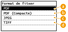 <PDF (Compacte)> comprimeix fotos i il·lustracions als documents més que el <PDF>. El fitxer serà més petit, però la qualitat d'imatge d'alguns documents o el nombre de documents que es poden llegir alhora pot ser inferior.