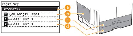 Öncelikle kağıt kaynağına yüklenen kağıdın boyutunu ve türünü belirtmeniz gerekir.