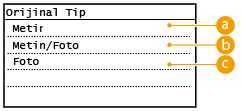 <Yoğunluk> <Oto Yoğunluk> olarak ayarlansa da, <Orijinal Tip> <Metin/Foto> veya <Foto> olarak ayarlandığında, <Oto Yoğunluk> iptal edilir.