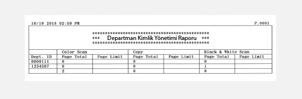 Departman Kimliği Yönetimi etkinleştirildiğinde, her bir Departman Kimliği için kopyalanan, yazdırılan ve taranan toplam sayfa sayısını kontrol etmek için bir rapor yazdırabilirsiniz. Rapor kullanımı denetlemenizi ve yönetimi geliştirmenizi sağlar.