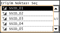 Kablosuz bağlantı bir kablosuz yönlendirici seçilerek ayarlandıysa, WEP kimlik doğrulama yöntemi <Open System> olarak veya WPA/WPA2 şifreleme yöntemi <Otomatik> (AES-CCMP veya TKIP) olarak ayarlanır. WEP kimlik doğrulaması için <Paylaşılan Anahtar> öğesini veya WPA/WPA2 şifrelemesi için <AES-CCMP> öğesini seçmek istiyorsanız manuel giriş yöntemini kullanarak bağlantıyı ayarlamanız gerekir ( Ayrıntılı Ayarları Belirterek Bağlantı Ayarlama).