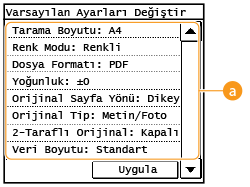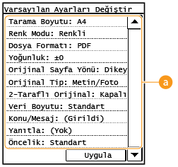 tuşuna bastığınızda görüntülenen ayarlardır. Bu varsayılan ayarları, sıkça gerçekleştirdiğiniz işlemlerle eşleşecek şekilde değiştirirseniz, tarama yaptığınız her seferde aynı ayarları yapılandırma gereksinimini ortadan kaldırabilirsiniz.