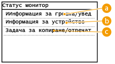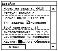 Показва текущия статус на избрания елемент. Екранът <Статус на зад. за коп./отпеч.> е показан по-долу като пример.