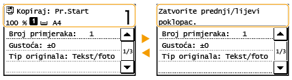 Poruke se prikazuju pri vrhu zaslona ako je razina tonera niska ili je poklopac ostao otvoren. Prikaz se mijenja iz prikaza običnog zaslona u prikaz poruke.