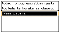 U nekim slučajevima pogreške prikazuju upute o otklanjanju pogreške. Da biste riješili problem, slijedite upute na zaslonu. Zaslon koji se prikazuje pri zaglavljenom papiru prikazan je ispod kao primjer (
