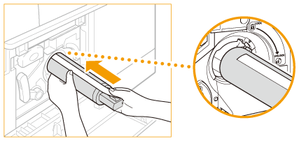 Pobrinite se da strana spremnika s naljepnicom bude okrenuta prema gore te ugurajte novi spremnik s tonerom u uređaj koliko dubina dopušta.