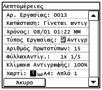 Εμφανίζει την τρέχουσα κατάσταση του επιλεγμένου στοιχείου. Παρακάτω απεικονίζεται η οθόνη <Κατ.Εργ.Αντιγρ./Εκτύπ.> ως παράδειγμα.