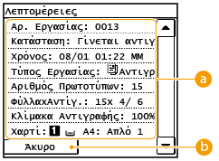 Εμφανίζονται ο αριθμός αντιγράφων, οι ρυθμίσεις και άλλες λεπτομέρειες. Εάν θέλετε μόνο να ελέγξετε τις λεπτομέρειες χωρίς να ακυρώσετε την αντιγραφή, πατήστε