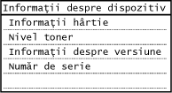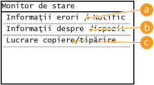 Afişează starea aparatului, precum cantitatea de hârtie sau toner disponibilă.