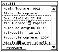 Afişează starea curentă a articolului selectat. Mai jos se afişează ecranul <Stare lucrare copiere/tipărire> ca exemplu.