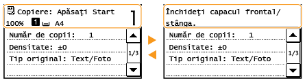 Ecranul <Pornire> pentru iniţierea operaţiilor şi ecranele pentru specificarea setărilor apar pe afişaj. De asemenea, aici puteţi să vizualizaţi progresul lucrării şi mesajele. Atingeţi afişajul pentru a-l acţiona.