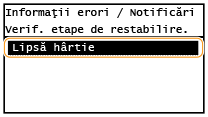 În anumite cazuri, când o eroare apare, sunt afişate instrucţiunile despre cum să acţionaţi pentru a remedia eroarea. Urmaţi instrucţiunile de pe ecran pentru a soluţiona problema. Mai jos este afişat ca exemplu ecranul care apare când are loc un blocaj al hârtiei (
