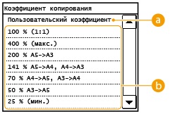 Можно увеличить или уменьшить размер копий, используя предварительно заданный коэффициент копирования, например <A5> → <A4>, или выбрав настраиваемый коэффициент копирования с шагом 1 %.