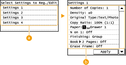 Можете регистровати до четири често коришћене комбинације поставки копирања. Једноставним избором регистроване комбинације поставки када вам је потребна, можете елинисати потребу за конфигурисањем истих поставки сваки пут када копирате, на пример ако често подешавате број копија на 5, подесите <Erase Frame> на <On>, и повећајте оштрину приликом копирања. Можете регистровати комбинације поставки као <Settings 1> у <Settings 4>.
