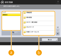 現在表示しているメニュー階層に属する設定項目が一覧表示されます。