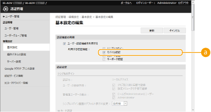 [Webサービスの認証方式 :]で選択した認証方式は、機器情報配信で個人認証を行う場合にも利用されます。機器情報配信時のユーザー認証を設定する