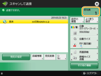 スキャン後に<ワンタッチ>画面から宛先を選択する場合は、<デフォルト画面の変更>で<ワンタッチ>を設定します。同じ宛先にスキャンする場合、設定する手間を減らすことができます。<送信> クライアント機に表示されるサーバー機のワンタッチ宛先は、以下のタイミングで最新の状態に更新されます。 クライアント機からの送信が完了したとき クライアント機でリセットキーを押したとき クライアント機でオートクリア機能が作動したとき |