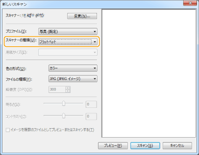 [スキャナーの種類]ドロップダウンリストから、原稿をセットした場所を選ぶ