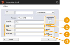 Si vous essayez d'envoyer un serveur de fichiers/Espace avancé dans lequel <Confirmer avant l'envoi> est défini sur <Oui>, un écran vous invitant à saisir un nom d'utilisateur et un mot de passe s'affiche. Dans ce cas, saisissez le mot de passe défini auparavant. Pour enregistrer un serveur de fichiers/Espace avancé dans une adresse de groupe, définissez <Confirmer avant l'envoi> sur <Non>. Vous ne pouvez pas envoyer une adresse de groupe comprenant un serveur de fichiers/Espace avancé dans lequel l'option <Confirmer avant l'envoi> est définie sur <Oui>.
