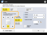 Les numéros de jeux de copies sont imprimés sur toutes les pages copiées. Les numéros de jeux de copies peuvent être imprimés avec des dates ou du texte. <Réglages d'impression> <Régl. options numérot. jeux de copies>Le texte pour la <Numérotation des pages> et le <Filigrane> peut également être sélectionné à partir du texte qui a été enregistré dans <Enreg. caractères pour Num. pgs/Filigrane>. Si vous sélectionnez deux options parmi <Numérotation des pages>, <Filigrane>, <Date d'impression> et <Numérotation jeux copies> pour imprimer dans la même position, un message vous demandant si vous voulez imprimer avec ces réglages s'affiche lorsque vous appuyez sur (Démarrer).Si vous définissez <Régl. options numérot. jeux de copies> sur <Oui>, les réglages que vous pouvez modifier changent comme suit. <Régl. options numérot. jeux de copies> Vous ne pouvez plus sélectionner <Toute la surface> et <Numéros à 5 endroits> comme positions d'impression dans le mode Numérotation des jeux de copies. Les tailles de numéro du mode Numérotation des jeux de copies deviennent <10,5 pt>, <12,0 pt> et <14,0 pt>. |