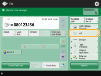 Pour vérifier le nombre total de destinataires spécifiésLe nombre total de destinataires spécifiés est affiché en haut à droite de l'écran. Cela vous permet de vérifier que le nombre de destinataires est correct avant de faire l'envoi. ![]() Pour envoyer avec les informations d'émetteurVous pouvez envoyer le fax avec le nom et le numéro de fax de l'expéditeur. <ID terminal émetteur> Pour vérifier les statuts pour les documents envoyésA l'écran <Suivi statut>, vous pouvez vérifier les statuts pour les documents envoyés. Cet écran vous permet de renvoyer des fax ou d'annuler l'envoi après avoir vérifié les statuts. Vérification de l'état et du journal concernant les documents envoyés et reçus Lorsque <Afficher notification à l'acceptation de la tâche> est réglé sur <Oui>, l'écran <Suivi statut> peut s'afficher à partir de l'écran suivant qui apparaît après la réception d'une tâche. <Afficher notification à l'acceptation de la tâche> ![]() Si une erreur de transmission se produit parce que la ligne du destinataire est occupéeLa machine rappelle automatiquement au bout d'un certain temps. Vous pouvez modifier les paramètres tels que le nombre de fois que la machine rappelle et l'intervalle entre les rappels. <Recomposition auto> Pour imprimer le rapport pour les résultats d'envoiSur l'écran des fonctions de base de la fonction Fax, vous pouvez appuyer sur <Options> <Rapport TX> pour pouvoir configurer l'impression automatique du rapport listant les résultats de l'envoi.Pour définir cette option pour chaque tâche à partir des <Options>, il est nécessaire de sélectionner <Erreur seulement> ou <Non> dans <Rapport TX>, puis de définir <Autoriser impression dans Options> sur <Oui>. Si plusieurs feuilles sont alimentées en même tempsLa numérisation s'arrête et le message s'affiche à l'écran. Suivez les instructions pour éliminer le bourrage papier. Une fois le bourrage éliminé, l'écran de reprise du travail s'affiche. Si l'appareil détecte par erreur le chargement de plusieurs feuilles, appuyez sur <Ne pas détecter chargeur/alim. multi> pour recommencer la numérisation. Pour configurer l'appareil à l'avance de sorte qu'il ne signale pas le chargement de plusieurs feuilles, effectuez une des opérations suivantes. A chaque envoi, appuyez sur <Options> sur l'écran des fonctions de base de la fonction Fax sélectionnez <Détecter chrgr/alim. multiple> pour désactiver le réglage. Définissez <Activer détection alim. multi. par chargeur par défaut> sur <Non> (<Activer détection alim. multi. par chargeur par défaut>). Lorsque des photos dans l'image envoyée sont trop sombres ou claires, les couleurs à l'arrière-plan des originaux en couleur ne peuvent être suppriméesLa qualité de l'image envoyée peut être améliorée si les conditions/paramètres suivants sont satisfaits. Type de tâche : Télécopie (envoi depuis la mémoire) ou Numérisation et envoi (Fax/I-fax) <Choisir couleur> : <Noir et blanc> (Numérisation et envoi) <Type d'original> : <Texte> <Densité> <Densité du fond> : <Auto><Résolution> : 200 ppp x 400 ppp, 300 ppp x 300 ppp*, 400 ppp x 400 ppp ou 600 ppp x 600 ppp* *Peut être défini pour Numérisation et envoi <Priorité vitesse/type d'image pour lecture N&B> Envois Fax/I-Fax : <Priorité qualité> (<Priorité vitesse/type d'image pour lecture N&B>)Lorsque plusieurs lignes téléphoniques sont définiesVous pouvez sélectionner la ligne téléphonique à utiliser pour envoyer des fax en appuyant sur <Options> <Sélection de la ligne>. Pour obtenir des instructions sur la spécification des réglages de ligne de fax, reportez-vous à la section Réglages de la ligne de fax. |