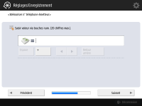Spécifiez les réglages nécessaires pour utiliser la fonction de télécopie. ![]() Si vous utilisez l'imageRUNNER ADVANCE C356i III / C256i III sans le produit en option requis pour utiliser sa fonction de télécopie (Options du système) ou si vous utilisez l'imageRUNNER ADVANCE C356P III, passez à l'étape 10. Sélectionnez la région/le pays si l'écran de sélection s'affiche et appuyez sur <Suivant>. ![]() ![]() Saisissez le numéro de fax et appuyez sur <Suivant>. Pour toute information sur les réglages de télécopie, voir Réglages de la ligne de fax. ![]() ![]() Appuyez sur <Régler>, saisissez le nom d'utilisateur et appuyez sur <Suivant>. ![]() ![]() Sélectionnez le type de ligne et appuyez sur <OK>. | |