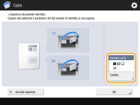 ![]() | Questa funzione consente di copiare sia la fronte che il retro di un documento d'identità su un unico foglio di carta. Questa funzione è utile quando si copiano documenti d'identità come la patente di guida, poiché l'orientamento e la posizione di stampa delle immagini di entrambi i lati del documento vengono allineati automaticamente in base al formato della carta. |