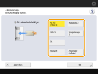 1 | Drücken Sie <Briefumschlag>. Der Typ des Briefumschlagpapiers kann nicht auf dem Detailbildschirm für <Papiertyp> ausgewählt werden. Um den Papiertyp für Briefumschläge auszuwählen, registrieren Sie den Papiertyp unter <Bevorzugtes Papier (Mehrzweckfach) speichern>, drücken Sie dann auf <Bevorzugtes Papier> und im zweiten Schritt auf die Taste, auf die der Papiertyp für Briefumschläge registriert wurde und dann auf <OK>. Registrieren von häufig verwendeten Papierformaten und Papiertypen für das Mehrzweckfach |