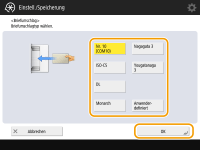 2 | Wählen Sie den Typ der Umschläge. ![]() Um ein anwenderdefiniertes Umschlagformat zu registrieren, drücken Sie <Anwenderdefiniert> <Weiter>, und drücken Sie <X> oder <Y>, um die Seite anzugeben. Verwenden Sie dann die Zifferntasten, um die Länge der entsprechenden Seite einzugeben. |
