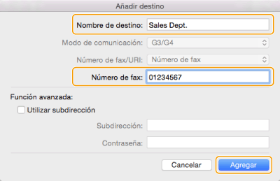 Introduzca el nombre de destino en [Nombre de destino] y el número de fax en [Número de fax], y luego haga clic en [Agregar] [Cancelar].