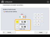 Puede registrar hasta cinco tamaños libres de papel de uso frecuente. Los tamaños de papel aquí registrados aparecen en la pantalla de selección del tamaño de papel para el casete y la bandeja multiuso (Especificación del tamaño y tipo de papel en el casete o Especificar el tamaño y el tipo de papel en la bandeja multiuso).