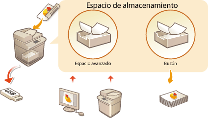 El disco duro instalado en el equipo cuenta con "espacio de almacenamiento" para guardar, compartir y editar documentos cargados. Si conecta dispositivos de memoria al equipo también dispondrá de espacio de almacenamiento externo. Busque y utilice el espacio de almacenamiento óptimo según sus necesidades.