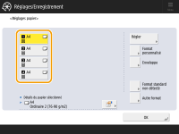 Formats de papier automatiquement détectablesSi <Personnalisé> s'affiche alors que du papier de format standard est chargé, appuyez sur <Format personnalisé>