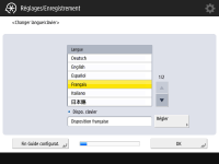 Sélectionnez la langue à afficher sur les écrans. Selon la langue choisie, il est possible de changer l'organisation du clavier affiché pour saisir les caractères. ![]() ![]() Sélectionnez la langue et appuyez sur <OK>. Pour changer l'organisation du clavier, appuyez sur <Régler>, sélectionnez l'organisation du clavier et appuyez sur <OK>. Si vous devez fréquemment la langue d'affichage, il est plus pratique d'afficher le bouton pour changer la langue. Changement de la langue d'affichage | |
