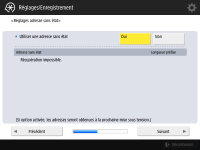 Spécifiez les réglages pour la connexion au réseau. ![]() ![]() Appuyez sur <Oui> pour <Utiliser IPv4> ou <Utiliser IPv6>, puis appuyez sur <Suivant>. Vous pouvez également utiliser IPv4 et IPv6 en même temps. Si vous appuyez sur <Non> pour <Utiliser IPv4> et <Utiliser IPv6>, et que vous appuyez sur <OK>, passez les réglages de réseau et passez à l'étape 9. Si vous appuyez sur <Oui> pour <Utiliser IPv4>, spécifiez les réglages suivants. ![]() Pour obtenir l'adresse IP automatiquement, appuyez sur <DHCP> ou <IP auto>, et appuyez sur <Suivant> ou <OK>. Pour spécifier l'adresse IP manuellement, effacez la sélection pour <DHCP> ou <IP auto>, appuyez sur <Adresse IP>, <Masque de sous-réseau>, et <Adresse de passerelle> pour saisir chaque valeur, puis appuyez sur <Suivant> ou <OK>. Pour information concernant les réglages pour les adresses IPV4, voir la section Configuration d'une adresse IPv4. ![]() Si vous appuyez sur <Oui> pour <Utiliser IPv6>, spécifiez les réglages suivants. ![]() Appuyez sur <Oui> pour utiliser l'adresse sans état ou <Non> dans le cas contraire, puis appuyez sur <Suivant>. Pour information concernant les adresses IPv6, voir la section Configuration d'une adresse IPv6. ![]() Après avoir spécifié l'adresse sans état, spécifiez les réglages suivants. ![]() Appuyez sur <Oui> pour utiliser l'adresse manuelle ou <Non> dans le cas contraire, puis appuyez sur <Suivant>. Pour utiliser l'adresse manuelle, appuyez sur <Adresse manuelle>, <Longueur préfixe> et <Adr. routeur par défaut> pour saisir chaque valeur. ![]() Après avoir spécifié l'adresse manuelle, spécifiez les réglages suivants. ![]() Appuyez sur <Oui> pour utiliser DHCPv6 ou <Non> dans le cas contraire, puis appuyez sur <OK>. | |